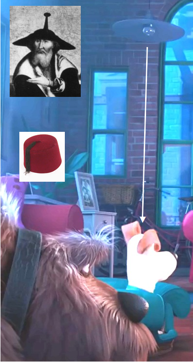 | In der Ins-Bett-geh-Szene des Films sitzen die Kontrahenten Duke und Max im dunklen Wohnzimmer. Die Bildelemente über ihren Köpfen deuten traditionelle Kopfbedeckungen an, die für den jeweiligen Kulturkreis/die jeweilige Religions-Gemeinschaft, der die beiden zugeordnet werden sollen, signifikant sind. Die rote, zylindrische Seitenlehne über Dukes Kopf ähnelt einem Fes. Wikipedia ordnet den Fes, einen roten Hut in Form eines Kegelstumpfes, dem Orient zu (vgl. Wikipedia, "Fes (Kopfbedeckung)"). Dagegen erinnert die stumpfkegelige Schirmlampe senkrecht über Max' Kopf an den sog. "Judenhut". Er war ursprünglich Teil der traditionellen Tracht der Juden im mittelalterlichen Europa. Als seitens der nicht-jüdischen Obrigkeit in einigen europäischen Ländern die Forderung laut wurde, er solle als Erkennungszeichen der Juden getragen werden, schwand seine Beliebtheit (vgl. Maike Vogt-Lüerssen: Alltagsgeschichte des Mittelalters; Wikipedia, "Judenhut"). Bildquelle "Mann mit Judenhut": kleio.org |
