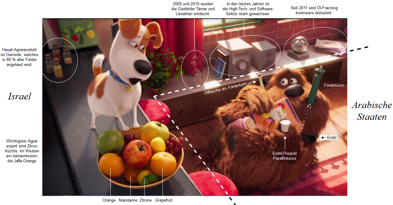 Der Reichtum der Israel umgebenden Arabischen Staaten entstammt dagegen der Erdölförderung und der Herstellung von Erdölprodukten. Israel fördert nur wenig Erdöl. Und erst 2009 und 2010 wurden die Gasfelder Tamar und Leviathan vor der israelischen Küste entdeckt. "Seit 2009 gehört das Land [dadurch] zu den führenden Exporteuren von Erdgas." (Wikipedia, "Wirtschaft Israels"). Im Jahr 2015 "[...] vereinbarten der russische Präsident Vladimir Putin und Israels Premierminister Benjamin Netanyahu die Vergabe umfangreicher Konzessionen an Gazprom, um die Leviathan-Lagerstätte zu entwickeln." (Wikipedia, "Leviathan (Erdgasfeld)"). Der Animationsfilm Pets thematisiert die unterschiedlichen Wirtschaftsfelder, die Israel und die Arabischen Länder ausmachen, durch Attribute, die den Repräsentanten Max und Duke beigefügt werden. |